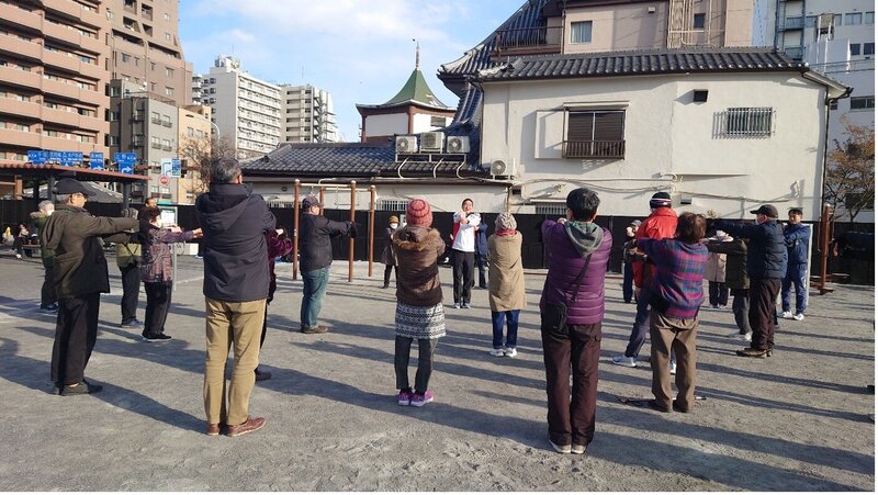 1/22(木)、天候に恵まれ快晴の空の下、台東区さかもと朝顔広場に地域指導員7名、参加者20名が集合し、教室の説明の後、健康遊具を順番に体験しました。